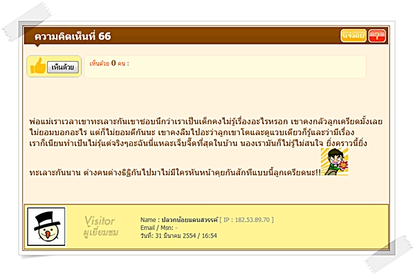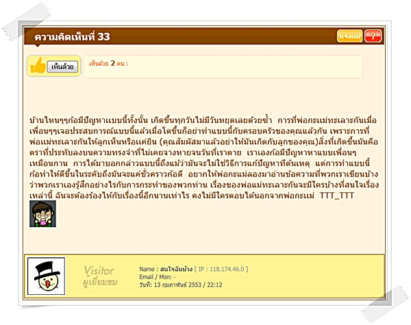 ตอนนี้รู้สึกไม่อยากกลับบ้านเลยครับ แต่ไม่กลับก็ไม่ได้เพราะสงสารน้องที่เหมือนจะถูกปล่อยเคว้งๆ แอบทำใจอยู่เหมือนกันว่าถ้าเขาจะหย่าก็ให้หย่าไปเหอะ ถ้าเขาหย่ากันจริงๆ ผมก็คงยอมไม่เรียนต่อโทเพื่อทำงานส่งน้องเรียนแทนเขาทั้งคู่ล่ะ ฮ่ะๆ จะปล่อยให้น้องไปอยู่กับใครคนหนึ่งผมคงยอมไม่ได้หรอก...