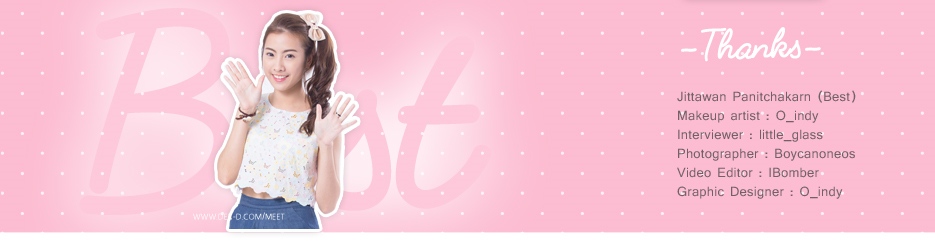 ชื่อเล่น :เบสท์ นิสัยส่วนตัว : เป็นคนร่าเริงแจ่มใส ยิ้มง่าย ไม่ค่อยโกรธค่ะ แต่ถ้าโกรธก็จะโกรธง่ายหายไว ฉายา : “ยาย” ค่ะ เพราะขี้บ่น เป็นคนเครียดเรื่องเรียนมาก โดยเฉพาะเวลาทำงานกลุ่มที่ทำอยู่ไม่กี่คน ก็จะบ่นๆ แต่สุดท้ายก็ทำจนเสร็จนะ ผลงานที่ผ่านมา : - เข้ารอบ 50 คน Miss Teen Thailand 2013 - เข้ารอบ 15 คน GossipGirls 2014 - ถ่ายแบบนิตยสาร Ray FB : Bestbest’src IG : Bestbest_src |