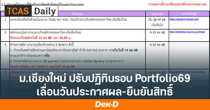 ม.เชียงใหม่ ปรับปฏิทิน TCAS69 รอบ Portfolio ช่วงวันประกาศผล-ยืนยันสิทธิ์