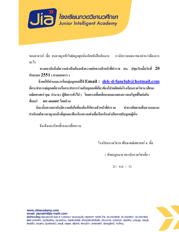 ตอนนี้ อ. แจ้งความแล้ว ก็ขอให้โชคดีนะคะ ^^ ไม่ได้ซ้ำเติมนะ แต่สมน้ำหน้า มาทำให้คนอื่นเสียหายก่อนนิ ทีหลังทำไรคิดดีดีก่อนนะคะ จำไว้เป็นบทเรียนละกัน