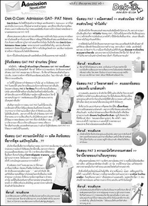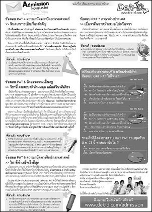 สวัสดีครับ.. Admission News Letter ฉบับประจำเดือนนี้จะได้พบกับข้อมูลการสอบ GAT PAT ในรอบตุลาคม 52 ที่เจาะลึกถึงลูกถึงคนในทุกวิชา เราจะพามาดูว่า ข้อสอบ PAT 3 ขายของเก่าทุกปีจริงเหรอ หรือบทความในข้อสอบ GAT เขามักจะหาจากที่ให้มา