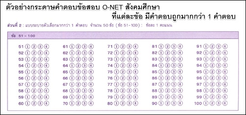 ถือได้ว่าเปลี่ยนนิดๆ ให้พอตื่นเต้นสำหรับ O-NET วิชาสังคมศึกษา ที่ครั้งนี้มีจำนวนคำถามทั้งหมด 100 ข้อ 100 คะแนน โดย 50 ข้อแรกไม่น่าห่วงมากเป็นปรนัย 4 ตัวเลือก ส่วน 50 ข้อหลังนั้นถือเป็นของใหม่ โดยเป็นปรนัย 4 ตัวเลือกเช่นกัน แต่จะมีคำตอบมากกว่า 1 คำตอบ โดยบางข้ออาจจะมีคำตอบ 1 , 2 , 3 หรือ 4 ข้อก็เป็นได้ ขึ้นอยู่กับว่าผู้ออกข้อสอบจะกำหนดไว้อย่างไร จ๊ากๆๆ