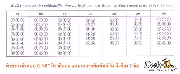 วิชาแรก คือ วิชาสุขศึกษา มี 50 ข้อ 50 คะแนน เป็นแบบปรนัย 4 ตัวเลือก ถัดมากับวิชาที่ 2 คือวิชาศิลปะ วิชานี้มี 40 ข้อ 100 คะแนน โดย 33 ข้อแรกเป็นปรนัย 4 ตัวเลือก ส่วน 7 ข้อหลังเป็นการฝนคำตอบแบบสัมพันธ์กันข้อละ 10 คะแนนกันเลยทีเดียว