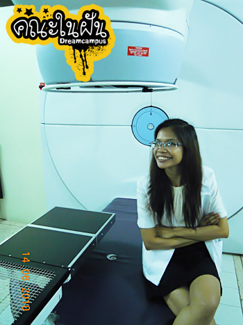 พี่หนู: งานที่ทำตอนนี้ก็คือนักรังสีการแพทย์ แผนกรังสีรักษา คณะแพทยศาสตร์กรุงเทพมหานครและวชิรพยาบาล พูดง่ายๆ ก็คือเป็นเจ้าหน้าที่ฉายแสงให้กับคนไข้ที่เป็นมะเร็งค่ะ ตอนนี้ประจำอยู่ห้องโคบอลต์ 60 ทำหน้าที่ควบคุมการฉายแสงค่ะ งานที่ทำจะเป็นงานที่ทำกับคนไข้ที่เป็นมะเร็งไม่ว่าจะระยะไหน จะเรียกว่ายังไงนักรังสีการแพทย์จะอยู่กับคนไข้มากที่สุด ว่ากันว่าอาทิตย์หนึ่งเราเจอกันห้าวันกันเลยทีเดียว นอกจากการฉายแสงที่ทำทุกวันแล้ว การถามอาการความผิดปกติของคนไข้ก็เป็นหนึ่งอย่างที่ต้องทำค่ะ