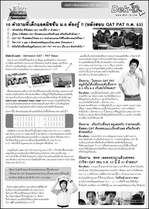 สวัสดีครับ.. Admission News Letter ฉบับที่ 4 ประจำเดือนกรกฎาคมมาแล้วครับ มาพร้อมกับคำถามที่เกิดขึ้นมากมายหลังการสอบ GAT PAT รอบกรกฎาคม 53 ซึ่งวันนี้ พี่ลาเต้ ได้รวบรวมมา แล้วไปหาคำตอบแบบสมบูรณ์แบบที่สุดมาให้ทราบกันคร๊าบ น้องๆ ม.6 ที่ไปสอบ GAT PAT ห้ามพลาดเด็ดขาด !!