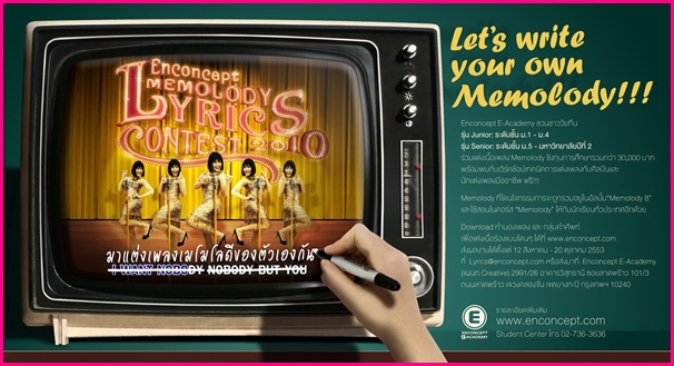 ว้าวๆ แค่ฟังชื่อก็น่าสนุกแล้ว โดยกิจกรรมนี้ จะเปิดให้น้องๆ มาแข่งขันแต่งเพลงเพื่อชิงทุนการศึกษารวมมูลค่ากว่า 30,000 บาท (ว้าวๆๆๆ) พร้อมทั้งประกาศนียบัตรสวยหรู ที่มีประทับชื่อโครงการเจ๋งๆ ว่า โครงการประกวดแข่งขันการแต่งเพลงจากกลุ่มคำศัพท์และทำนองเพลงที่กำหนดให้ Enconcept Memolody Lyrics 2010