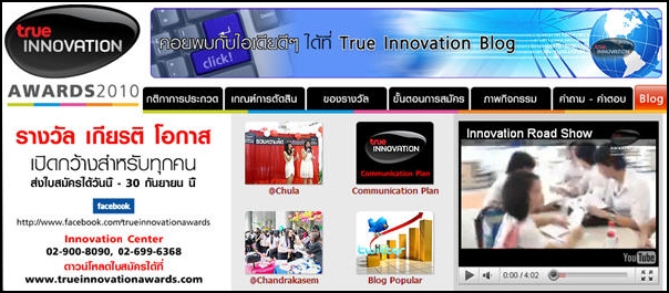 สวัสดีครับ.. ข่าวดี สำหรับน้องๆ เด็กมหาลัย ที่กำลังไฟแรง และอยากเป็นนักธุรกิจชั้นนำในอนาคต ล่าสุดโปรดเตรียมตัว เตรียมใจ และเตรียมไอเดียดีๆ ไปแชร์กันในกิจกรรม True Innovation Awards 2010 กิจกรรมที่จะส่งให้น้องๆ ทุกคนเป็นนักธุรกิจชั้นเยี่ยมได้ ว้าวๆๆ