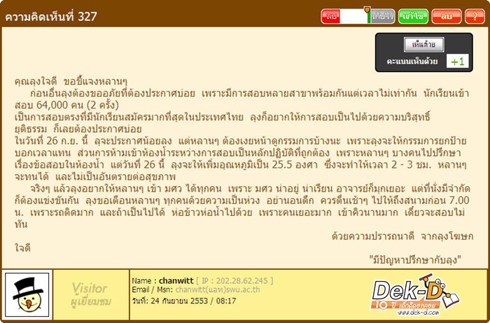 ล่าสุด กระแส คุณลุงโฆษก เหมือนจะฟีเวอร์เพิ่มขึ้นเรื่อยๆ วัดจากจำนวนคอมเม้นในบอร์ดแอดมิชชั่นที่ถี่ขึ้นเรื่อยๆ จนแถมล่าสุด คุณลุงฆกของพวกเรา ก็ได้เข้ามาอ่านกระทู้แอดมิชชั่นที่พูดถึงในเว็บ Dek-D และได้โพสข้อความถึงน้องๆ ที่จะไปสอบตรง มศว 54 ไว้ว่า