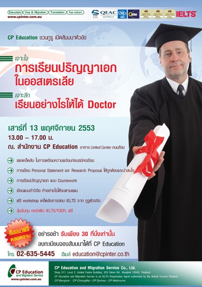 สัมมนาหัวข้อ "การเรียนปริญญาเอกในออสเตรเลีย" ที่จะให้ข้อมูลและเคล็ดลับของการเรียนปริญญาเอกอย่างละเอียดยิบ การเตรียมพร้อมก่อนสมัครเรียน , การเขียน personal statement และ research proposal , การเรียนปริญญาเอกแบบ coursework , การเรียนแบบทำวิจัย เคล็ดลับการสอบ IELTS รวมถึงลุ้นรับทุนคอร์สติว TOEFL / IELTS ฟรี งานนี้จะจัดขึ้นในวันเสาร์ที่ 13 พ.ย. นี้ ตั้งแต่เวลา 13.00-17.00 น. ณ สำนักงาน CP Education อาคาร United Center สีลม ใครสนใจรีบสำรองที่นั่งได้ที่เบอร์ 02-635-5445 ตามรายละเอียดในรูปภาพด้านบนเลยค่ะ