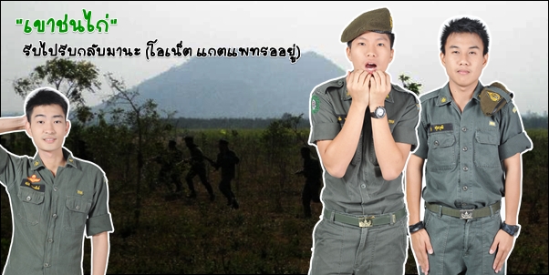 เรื่องโหดๆ ที่เคยเจอในเขาชนไก่ เบนซ์ : ก็ไม่โหดมากนะ ที่ต้องปฏิบัติภาคสนาม คือต้องวิ่งประจำตำแหน่งปืนของตัวเอง แล้วตอนที่คลานต่ำเพื่อลอดลวดอ่ะ หนักหัวมากเลย เพราะต้องใส่หมวกทหารประมาณ 10 กิโล แล้วตอนคลานกางเกงเบนซ์ก็เกี่ยวกับลวด แต่ รด. ปี 3 นี้โหดแน่นอน -*- ปอนด์ : โดนนอนหมอบกลางแอ่งน้ำครับ เฝ้าเวรยามเสร็จก็ดีใจ รีบเข้าห้องน้ำ เพราะปวดท้องเกินจะทนไหว พอออกมาแล้วก็มีความรู้สึกว่าโล่ง ๕๕๕๕ เลยเฮฮากับเพื่อนเต็มที่ เสียงนกหวีด ปี๊ดด! มาแต่ไกล ตามมาด้วยคำว่า "หมอบ!" เท่านั้นแหละ เฮฮาไม่ออกเลย ๕๕๕๕ โบ๊ท : ก็เป็นเรื่องฝึกนี้ล่ะครับ ไอ้เราก็ไม่เคยฝึกจริงๆ จังๆ มาก่อน พอมาเจอไม้แข็งก็แทบสลบเหมือนกัน จำได้ว่าวันนั้นแดดร้อนมาก จนเราฝืนต่อไปไม่ไหวจริงๆ ก็เลยกลับเขาเต้นท์พยาบาลไป 555555555+