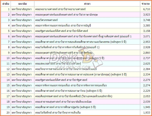 สวัสดีครับ.. ครั้งก่อนโน่นน พี่ลาเต้ มีบทความ 20 สาขาที่น่าจะถูกเลือกเยอะที่สุดของจุฬาฯ มาให้ดู วันนี้ขอต่อเนื่องด้วยมหาวิทยาลัยชายฝั่งทะเล อย่าง มหาวิทยาลัยบูรพา ที่มีสถิติ 20 สาขาที่น่าสนใจไม่น้อย ลองไปดูซิว่า จะมีสาขาที่เราอยากเรียนไหม
