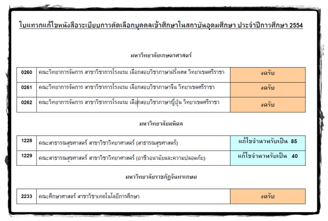 ประกาศแก้ไขระเบียบการฯ54 ข้างต้นมีให้โหลดในเว็บไซต์ www.cuas.or.th ด้วย น้องๆ สามารถเข้าไปดาวน์โหลดกันได้ แล้วก็อย่าลืมอัพเดทข่าวแอดมิชชั่นที่เว็บเด็กดีกันเรื่อยๆ นะ เพื่อผลประโยชน์ของน้องๆ เองค่ะ^^
