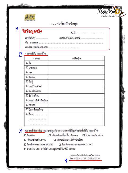 แก้ไขคราวนี้ก็ขอให้น้องๆ รอบคอบ อย่าให้ผิดอีก!! เสร็จแล้วให้แฟกซ์แบบฟอร์มและเอกสารที่เกี่ยวข้องกับสิ่งที่น้องๆ แก้ไข ไปที่สมาคมอธิการบดีแห่งประเทศไทย (สอท.) เบอร์ 0-2354-5155, 0-2354-5156 ย้ำนะคะ ว่าเฉพาะทางแฟกซ์เท่านั้น