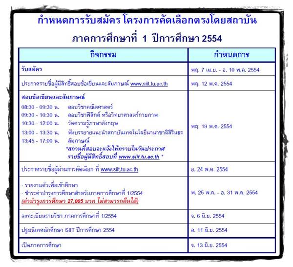 สวัสดีค่า^^ ช่วงนี้แต่ละมหาวิทยาลัยเปิดรับตรงกันมาเรื่อยๆ เลยนะคะ ซึ่งก็มีทั้งภาคปกติและภาคพิเศษ อย่างวันนี้ที่พี่มิ้นท์นำข่าวมาบอกกันก็เป็นหลักสูตรนานาชาติ ของสถาบันเทคโนโลยีนานาชาติสิรินธร ธรรมศาสตร์ หรือที่รู้จักกันว่า SIIT นั่นเอง รายละเอียดการรับสมัครโครงการคัดเลือกตรงโดยสถาบัน มีดังนี้ค่ะ
