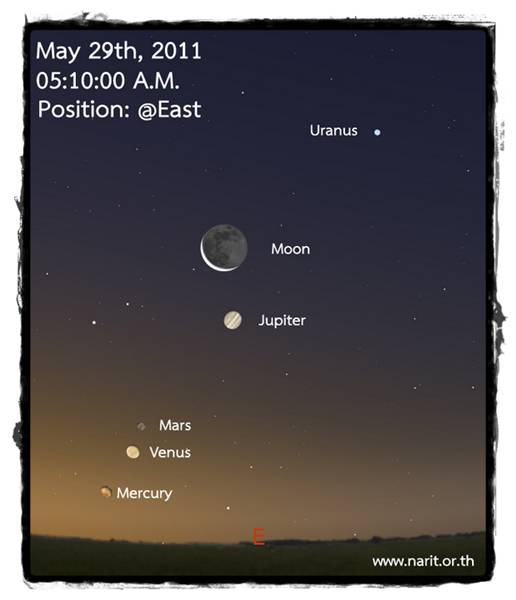 ภาพตำแหน่งดาวเคราะห์และดวงจันทร์ในตอนเช้าของวันที่ 29 พ.ค. เวลา 05.10 น.