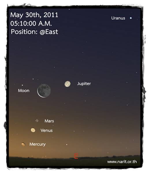 ภาพแสดงตำแหน่งดาวเคราะห์และดวงจันทร์ในตอนเช้าของวันที่ 30 พ.ค. เวลา 05.10 น.