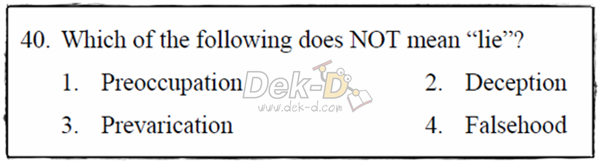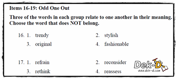ตัวอย่างด้านบน เป็นส่วนของการวัดศัพท์แน่นอนร้อยเปอร์เซ็นต์ จะเห็นได้ว่าจะใช้เพียงโจทย์เดียว นั่นก็คือหาคำที่แตกต่างจากพวกนั่นเอง