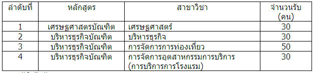 สาขาวิชาการจัดการการท่องเที่ยวและการจัดการอุตสาหกรรมการบริการ - รับนักเรียนทุกแผนการศึกษา - มีผลการเรียนเฉลี่ยรวม (GPAX) ไม่น้อยกว่า 2.50 - มีผลการเรียนเฉลี่ย (GPA) กลุ่มสาระภาษาต่างประเทศ ไม่น้อยกว่า 2.50 - มีผลการเรียนเฉลี่ย (GPA) กลุ่มสาระสังคมศึกษาและวัฒนธรรม ไม่น้อยกว่า 2.50