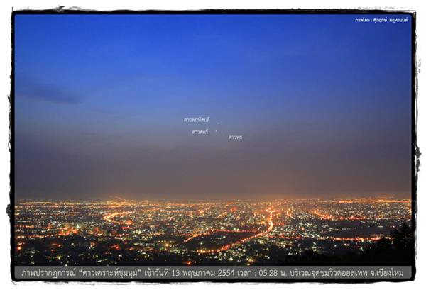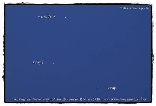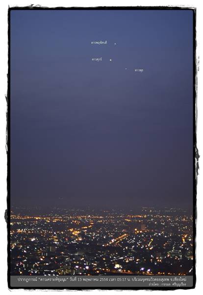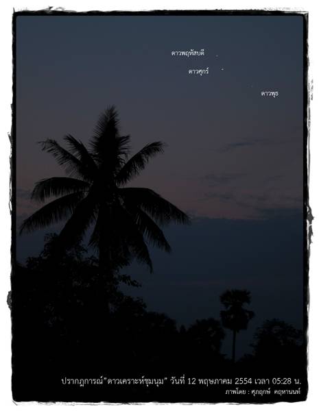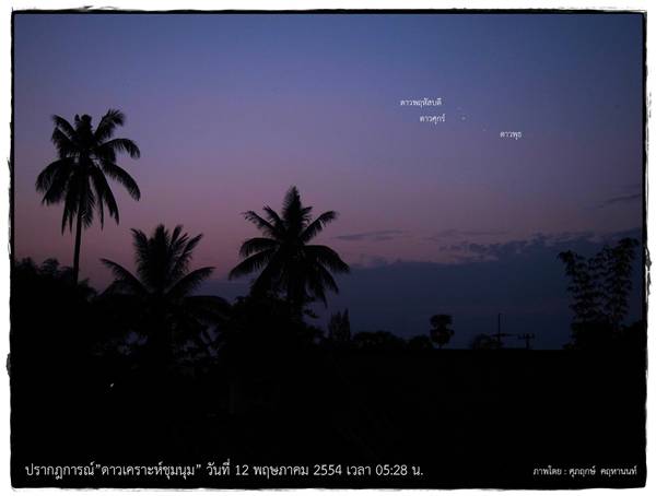 สวัสดีค่ะน้องๆ^^ เมื่อต้นอาทิตย์ พี่มิ้นท์ ได้ประชาสัมพันธ์ข่าวเกี่ยวกับปรากฏการณ์ดาวเคราะห์ชุมชนหรือดาวเคราะห์ชุมนุมไป เห็นเค้าว่ากันว่าสวยมากๆ เลย แต่สำหรับใครที่มองไม่เห็น หรือตื่นมาดูไม่ทัน ไม่ต้องเสียใจนะ พี่มิ้นท์เอาภาพสวยๆ มาฝากกันค่ะ หากใครพลาดช่วงนี้ อย่าเพิ่งเสียใจไป ในช่วง 27-30 พฤษภาคม 2554 ยังสามารถติดตามอีกหนึ่งปรากฏการณ์บนท้องฟ้าได้ นั่นคือดาวเคราะห์หลายดวงเรียงตัวกันจนเกือบจะเป็นเส้นตรง (ดาวยูเรนัส ดาวพฤหัสบดี ดาวอังคาร ดาวศุกร์และดาวพุธ) บนท้องฟ้าทางทิศตะวันออก ขณะที่ในช่วงเวลานั้นจะมีดวงจันทร์ข้างแรมซึ่งเป็นเสี้ยวเล็กๆ ปรากฏอยู่ในแนวการเรียงตัวกันของดาวเคราะห์อีกด้วย ซึ่งเป็นภาพที่สวยงาม และไม่ได้เห็นกันบ่อยนัก โดยเฉพาะอย่างยิ่งในวันที่ 29 และ 30 พฤษภาคม ดวงจันทร์จะเป็นเสี้ยวบางๆ ใกล้กับดาวพฤหัสบดี แค่นึกภาพตามก็น่าดูมากๆ แล้วนะ ถ้าได้มีโอกาสดูจริงๆ ก็คงจะเยี่ยมไปเลย สำหรับภาพสวยๆ วันนี้ก็ต้องขอบคุณสถาบันวิจัยดาราศาสตร์แห่งชาติด้วยค่ะ ไว้หลังจากผ่านสิ้นเดือนนี้ไป พี่มิ้นท์ จะนำภาพปรากฏการณ์ดาวเคราะห์เรียงตัวกันมาฝากให้น้องๆ ได้ดูกันอีกนะคะ^^ ปล.ถ้าอยากเข้าไปดูภาพชัดๆ เต็มๆ (ย่อมาอาจจะไม่ค่อยชัดเท่าไหร่) เข้าไปดูได้ ที่นี่ ค่ะ |