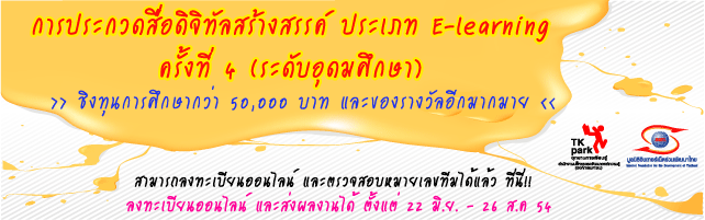 เปิดรับสมัครแล้ว ตั้งแต่วันที่ 22 มิ.ย. 15 ส.ค. 2554 นี้ โดยผู้สนใจส่งผลงานประกวดในรูปแบบสื่อดิจิทัลเพื่อการศึกษาประเภท E-learning ต้องมีเนื้อหาใน 8 กลุ่มสาระการเรียนรู้พื้นฐาน ได้แก่ ภาษาไทย สังคมศึกษาและวัฒนธรรม ภาษาต่างประเทศ วิทยาศาสตร์ คณิตศาสตร์ สุขศึกษาและพลศึกษา ศิลปะ การงานอาชีพและเทคโนโลยี ศิลปวัฒนธรรมท้องถิ่นและประชาคมเศรษฐกิจ (เลือกทำเนื้อหากลุ่มสาระใดสาระหนึ่งต่อหนึ่งชิ้นงานเท่านั้น) น้องๆ ชาว Dek-D.com ที่สนใจ สามารถคลิกเข้าไปชมตัวอย่างผลงานสื่อดิจิทัลเพื่อการศึกษาประเภท E-Learning กันได้ที่นี่เลยค่ะ www.inetfoundation.or.th/file.php?Category=contest_media ส่วนใครที่ไม่พลาดกิจกรรมดีๆ แบบนี้แน่ๆ รีบสมัครออนไลน์ผ่านเว็บไซต์ www.inetfoundation.or.th เพื่อรับหมายเลขประจำทีม แล้วจึงดาวน์โหลดใบสมัคร (ตัวจริง) ส่งมาพร้อมกับผลงานภายหลัง อ่านกติกาการการประกวดสื่อดิจิทัลสร้างสรรค์ ครั้งที่ 4 (ระดับอุดมศึกษา) เพิ่มเติมได้ที่ www.inetfoundation.or.th/news.php?act=show&Id=205 รีบๆ กันหน่อยนะจ๊ะ รับสมัครถึงวันที่ 15 ส.ค. 2554 นี้เท่านั้นจ้า ^^