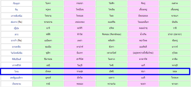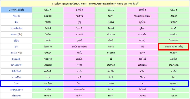 - เมื่อใช้จนหมดชุดแรกให้ใช้ชื่อแรกของคอลัมน์ที่อยู่ถัดไป เช่น พายุที่เกิดหลังพายุ จ่ามี จะใช้ชื่อ กองเรย และเมื่อใช้จนหมดชุดที่ 5 ให้กลับมาใช้ชื่อแรกของชุดที่ 1 เช่น พายุที่เกิดหลังพายุ ซาวลา จะใช้ชื่อ ดอมเรย
