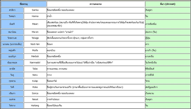 ลาเต้ลิขิต : พี่ลาเต้แอบลองดูรายชื่อพายุในตาราง แอบคุ้นอยู่หลายชื่อเหมือนกันนะเนี่ย เช่น เมขลา , ไม้สัก , จำปี , อินฟ้า , มิลดอลเล จำได้เลยว่ามาแต่ละที หลังคาบ้านแทบหาย ไฟฟ้าดับไปหลายชั่วโมง หึหึ พี่ลาเต้ ขอขอบคุณข้อมูลประกอบจาก เว็บวิกิพีเดีย |