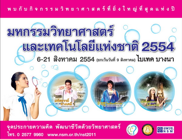 สำหรับปีนี้ ก้าวสู่ปีที่ 6 แล้วสำหรับงาน มหกรรมวิทยาศาสตร์และเทคโนโลยีแห่งชาติ งานที่รวบรวมสุดยอดกิจกรรมทางวิทยาศาสตร์และเทคโนโลยีที่ยิ่งใหญ่ที่สุดของปี เนื่องใน สัปดาห์วิทยาศาสตร์แห่งชาติ จัดโดยกระทรวงวิทยาศาสตร์และเทคโนโลยี จุดมุ่งหมายของงานในปีนี้ ยังคงเดินหน้ากระตุ้นให้คนไทยหันมาสนใจวิทยาศาสตร์ ภายใต้แนวคิด จุดประกายความคิด พัฒนาชีวิตด้วยวิทยาศาสตร์ โดยดึง 3 นักแสดงดาวรุ่ง อ๋อม-อรรคพันธ์ นะมาตร์, เก้า-จิรายุ ละอองมณี และญาญ่า-อุรัสยา เสปอร์บันด์ มาเป็นพรีเซนเตอร์ ชวนเยาวชนไทยเรียนรู้นอกห้องเรียนอย่างเพลิดเพลิน สนุก ตื่นเต้น ท้าทาย กับกิจกรรมที่มากมายองค์ความรู้ในงานมหกรรมวิทยาศาสตร์และเทคโนโลยีแห่งชาติ ประจำปี 2554