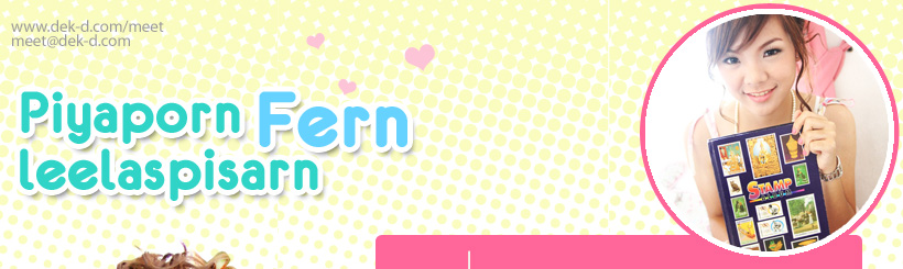 ![]() | สวัสดีชาว Dek-D ค่ะ ชื่อ ปิยาภรณ์ ลีลาศพิศาล ชื่อเล่น เฟิร์น อายุ 19 ปี ศึกษาที่มหาวิทยาลัยหัวเฉียวเฉลิมพระเกียรติ ปี 1 คณะบริหารธุรกิจ สาขาการจัดการ ค่ะ นิสัยส่วนตัว : กินเก่ง พูดมาก เอ๋อ นี่แหล่ะค่ะ ใช่เลย 555 หนังที่ชอบ : ชอบดูหนังผีมากเลย กลัวนะคะ แต่ชอบมาก ตื่นเต้นดี การ์ตูนที่ชอบ : เฟิร์นชอบโคนันมาก เพราะเฟิร์นชอบแนวนี้อยู่แล้ว ดูน่าตื่นเต้นค้นหาตามค่ะ ดอกไม้ที่ชอบ : ชอบดอกลิลลี่ เพราะว่าเห็นแล้วสบายตา แล้วมันก็สวยดีค่ะ สีที่ชอบ : ชอบสีแดงค่ะ เพราะดูแล้วแบบมันจี๊ดมันเจ็บดี สัตว์เลี้ยงแสนรัก : แฮมสเตอร์ค่ะ เพราะมันน่าเลี้ยงน่ากอดมากเลย ไอดอลคนโปรด : อั้มพัชราภา ยกให้เป็นไอดอลของเฟิร์นเลย พี่เค้าสวยและเก่งทุกๆ ด้านมาก ติดตามผลงานพี่เค้าทุกชิ้นเลย ชอบมากเลยคนนี้ เรื่องที่ภูมิใจสุดๆ : เรียนได้เกรด 3 ขึ้น ดีใจมากค่ะ เพราะเฟิร์นตั้งใจมาก และผลออกมาตามที่คาดหวังไว้เลย นิยามตัวเองสามคำ : ชิว บ้า เอ๋อ | |||||||
