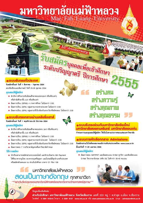 สวัสดีค่ะน้องๆ^^ ใครที่พลาดโอกาสจากรับตรงโควตาภาคเหนือของ แม่ฟ้าหลวง กลับมาเฮได้อีกรอบแล้วค่ะ ตอนนี้ม.แม่ฟ้าหลวง เปิดรับตรงทั่วประเทศแล้ว เด็กซิ่วก็สามารถสอบได้ โดยเปิดให้เลือกหลายสาขา เข้าได้หลายแผนการเรียน ทีนี้จะอยู่ภาคไหนก็มาสมัครกันได้เลย กำหนดการรับสมัคร สิ่งสำคัญที่จำเป็นต้องรู้