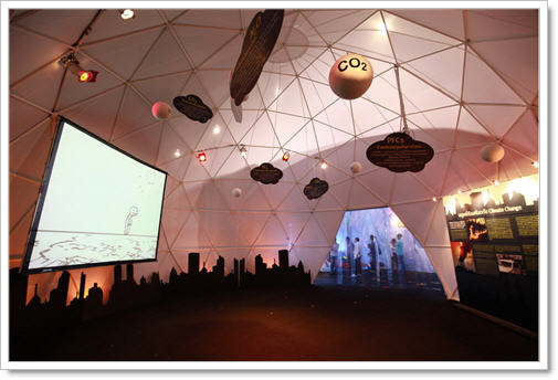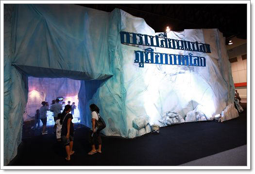 จุดที่น่าตื่นตาตื่นใจในงานมีมากมายเลย แบ่งเป็นโซนต่างๆ เกี่ยวข้องกับเรื่องสำคัญของโลกและสภาวะแวดล้อม เล่าอีกสามวันก็ไม่หมด ดังนั้นขอเจาะที่ไฮไลท์ของงานแล้วกันนะ ไปเริ่มที่... จุดสำคัญจุดแรก นิทรรศการเปลี่ยนแปลงภูมิอากาศโลก ซึ่งจะเห็นภูเขาน้ำแข็งขนาดใหญ่เด่นมาแต่ไกล ภายในมีไฮไลท์ที่พลาดไม่ได้เลยก็คือ ภาพยนตร์ 4 มิติ เกี่ยวกับปรากฏการณ์โลกร้อน ที่นอกจากจะต้องใส่แว่นสามมิติดูแล้ว ยังจะได้สัมผัสแรงสั่นสะเทือน ทั้งกลิ่น ทั้งเสียง แบบลืมไม่ลง!