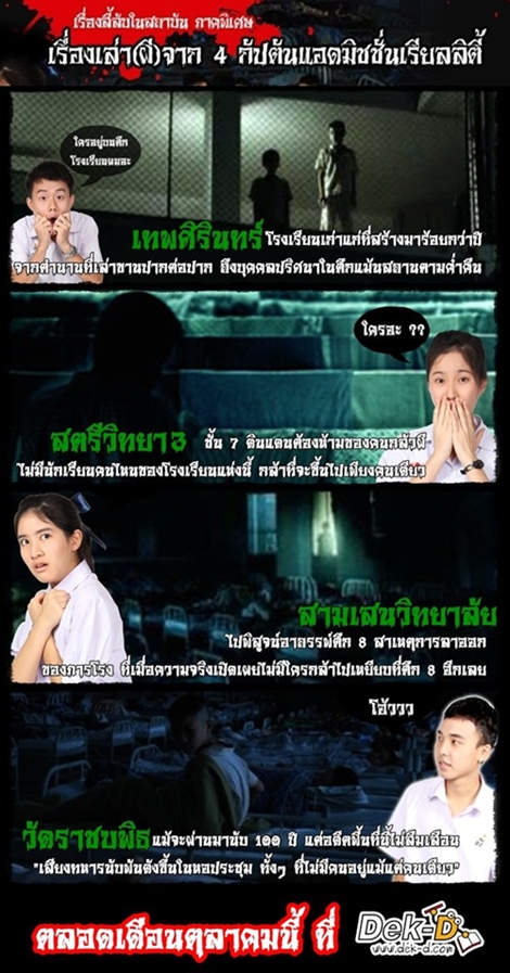 สวัสดีครับ ต้อนรับเทศกาลฮาโลวีน 2011 ตลอดเดือนตุลาคมนี้ คอลัมน์เรื่องลี้ลับในสถาบันจะเป็นภาคพิเศษ "เรื่องเล่า(ผี)จาก 4 กัปตันแบรนด์แอดมิชชั่นเรียลลิตี้ ปี 3 โดยทุกๆ สัปดาห์จะมีเรื่องผีจาก 4 โรงเรียนชื่อดังมาเล่าให้ฟังกันครับ ซึ่งเป็นเรื่องเล่าตำนานที่เกิดจริงในโรงเรียนของ 4 กัปตัน BRANDS Admission Reality ปี 3 นั้นเอง