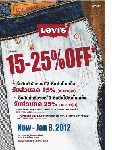 ซื้อสินค้าลีวายส์ 3 ชิ้นต่อใบเสร็จรับส่วนลดทันที25 % (เฉพาะรุ่น)