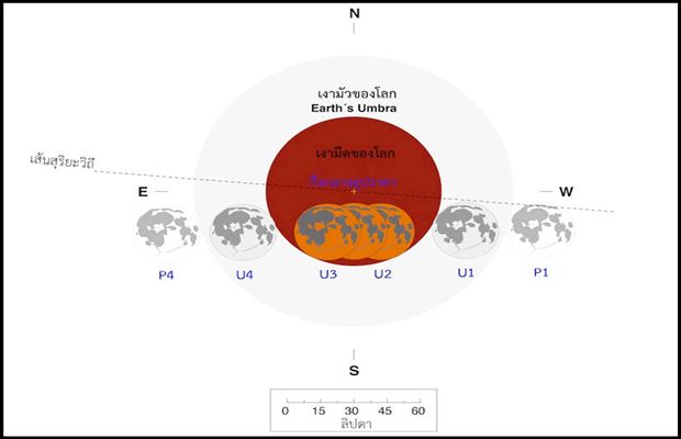 ภาพแสดงตำแหน่งดวงจันทร์เทียบกับเงาของโลกขณะเกิดปรากฏการณ์จันทรุปราคาในวันที่ 10 ธ.ค. 54