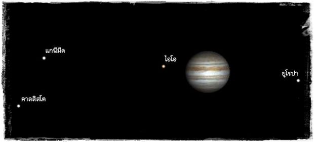ภาพแสดงตำแหน่งดวงจันทร์บริวารของดาวพฤหัสบดีขณะเกิดปรากฏการณ์จันทรุปราคาของดาวพฤหัสบดี