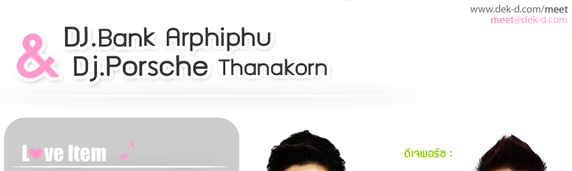 | รู้จัก Dek-D.com มานานแค่ไหนแล้ว : ดีเจแบงค์ : นานมาก ชอบความที่เด็กดีเป็นศูนย์รวมวัยรุ่นครับ ดีเจพอร์ช : นานแล้วครับ เป็นเว็บที่ชอบเข้ามาดูผู้หญิง 55+ ไม่ใช่ละ ชอบดูข่าวสารต่างๆ ต่างหาก เยอะมากๆ แล้วก็พวกกระทู้ต่างๆ ครับ เพลินดี ผมเคยลงด้วยนะ ทำเป็นเล่นไป 55+ ฝากถึงเพื่อนๆ ชาว Dek-D.com : ดีเจแบงค์ : ก็แฟนๆ เด็กดีนะครับ ยังไงติดตามเด็กดีแล้ว อ่านนิยายที่เด็กดี ดูท็อปปิกต่างๆ ของเด็กดี ก็มาฟังปิ๊งของพวกเรา ไปด้วยแล้วกันนะครับ แล้วก็ฝากซิทคอมคลื่นใสวัยปิ๊ง ททบ5 เวลา 17.40 น. รายการ club5 แล้วก็ MV อย่าบอกว่าเธอไม่มีใคร ครับ ดีเจพอร์ช :ก็ฝากให้ติดตามเว็บ Dek-D.com กันเยอะๆ แล้วก็อย่าลืมหมุนมาฟัง Pynk 98 fm กันเยอะๆ นะครับ รวมถึงซิทคอมคลื่นใสวัยปิ๊ง แล้วก็งานพิธีกรคลับไฟว์ด้วยครับ |