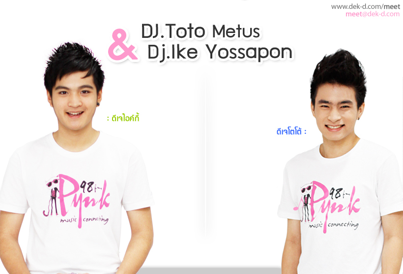 รู้จัก Dek-D.com มานานแค่ไหนแล้ว : ดีเจโตโ้ต้ : รู้จัก Dek-D.com จากเพื่อนครับ ประมาน 4 ปีแล้ว ชอบเว็บบอร์ดครับ มีเรื่องต่างๆ ให้คอยอัพเดทอยู่ตลอดเลย ดีเจไอค์กี้ : ส่วนผมรู้จัก Dek-D.com นานมากแล้วนะครับ ตั้งแต่ที่บ้านมีเน็ตใช้อะ 5555+ ชอบเพราะมันมีตั้งแต่สากกระเบือ ยันเรือรบ มีให้ผมทุกอย่างอะครับ 555+ ส่วนใหญ่จะเป็นความรู้อะครับ ที่ได้มามากเลยทีเดียว ฝากถึงเพื่อนๆ ชาว Dek-D.com : ดีเจโตโ้ต้ : ก็ให้เข้ามาเล่นเว็บนี้บ่อยๆ มาแลกเปลี่ยนความคิดเห็น อัพเดทตามเทรนด์กันครับ ดีเจไอค์กี้ :เช่นกันครัล ก็ขอเป็นกำลังใจให้เพื่อนๆ พี่ๆ น้องๆ ทุกคนในการดำรงชีวิตนะครับ ทำในสิ่งที่ตนเองรัก รักในสิ่งที่ตนเองทำ แค่ทำดีไม่เดือดร้อนใครก็พอแล้วครับ สู้ๆ ครับ แล้วก็ฝากผลงานของเรา สองคนครับ ดีเจคลื่น PYNK 98 FM ทุกวันจันทร์-ศุกร์ 23.00-01.00น., ละครซิทคอมเรื่องคลื่นใสวัยปิ๊งค์ ช่อง ททบ.5 ทุกวันจันทร์-ศุกร์ 17.45-18.00 ครับ แล้วก็พิธีกรรายการ ClubFive ช่อง ททบ.5 ทุกวันหยุดนักขัตฤกษ์ 09.00-09.25น. ครับ |