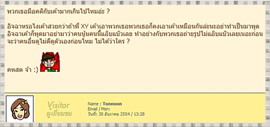 ถ้าเราผิดจริงก็คงยอมแพ้ไปนานแล้ว แต่นี่มันจู่ๆก็ด่าเรา เราโมโหมากเลยพิมพ์โต้กันไป ใช้คำว่า 'ศักดิ์ศรีลูกผู้หญิง ไม่ยอมให้ผู้ชายหน้าตัวเมียคนเดียวมาด่าปาวๆฝ่ายเดียว' แต่ผลคือเราก็ต้องเป็นฝ่ายถอย (อยู่ดี) และคือเราเคยไล่ดูตามกระทู้เก่าๆที่มันเคยเม้นท์ มันเอาชื่อเราไปนินทาแล้วบอกว่า 'ผมไม่ใช่คนชอบหาเรื่องใครหรอกครับ แต่ก็ไม่ยอมคนเหมือนกัีน'