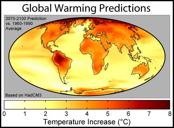 จากภาพข้างบน เป็นภาพการทำนายอุณหภูมิของโลกที่จะเพิ่มขึ้นจากภาวะโลกร้อน ในปี 2070 - 2100 หรือ ปี พ.ศ.2613 - 2653 (จะอยู่ถึงมั้ยเนี่ย)โดยใช้สีเป็นสัญลักษณ์ โดยหมายเลขข้างล่าง คือ ระดับอุณหภูมิที่จะสูงขึ้น มีหน่วยคือ องศาเซลเซียส ตรงไหนที่มีความเปลี่ยนแปลงน้อย ก็จะเป็นสีขาว เหลืองอ่อนๆ และส่วนที่เข้มๆ เลยคือ อุณหภูมิจะเปลี่ยนแปลงเพิ่มขึ้นถึง 8 องศาเซลเซียส หรือมากกว่า