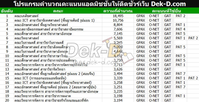 สวัสดีคร้าบ เรียกร้องกันมาเยอะมาก พี่ลาเต้ เลยจัดให้ !!! สำหรับ 40 สาขาที่ถูกคำนวณคะแนนมากที่สุดของมหาวิทยาลัยศิลปากรปี 55 โดยข้อมูลนี้ พี่ลาเต้ นำมาจากโปรแกรมคำนวณคะแนนแอดมิชชั่นให้ติดชัวร์ปี 55 ใครยังไม่เคยใช้ รีบไปลองใช้กันเลย ว่าแต่จาก 62 สาขาของ ม.ศิลปากร จะมีสาขาไหนที่ถูกคำนวณคะแนนช่วงหลังสอบ GAT PAT มีนาคม 55 มากที่สุด ไปดูพร้อมกันเลยครับ ![]() ปล.ข้อมูลด้านบนนี้เก็บข้อมูลจากวันที่ 10 ม.ค. - 12 มี.ค. 55