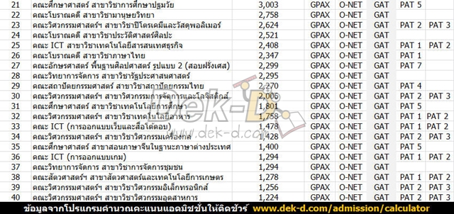 เข้าไปใช้โปรแกรมคำนวณคะแนนแอดมิชชั่นให้ติดชัวร์เว็บ Dek-D คลิกที่นี่ ได้เลย 11-20 เมษายนนี้ อย่าลืมไปใช้สิทธิ์เลือกคณะที่ถูกใจนะครับ สู้ๆๆ ติดอันดับ 1 ทุกคน แจ้งน้องๆ ที่สมัครรับข่าวแอดฯผ่าน SMS ในเดือน มี.ค.-เม.ย.นี้ รอพบ SMS เด็ดๆ ดังนี้ - เกาะติดทุกเหตุการณ์ GAT PAT 2/55 (ตั้งแต่เข้าสอบ จนถึงวันประกาศผล) ![]() - รู้ก่อนใครจากวงใน!! ค่า Mean Max Min ม.6 รุ่นนี้ (ท่าทีคะแนนปีนี้ สูงจริงหรือ ?) - เปิดโผคณะมาแรง คณะอันตราย ประกอบตัดสินใจแอดมิชชั่นให้ติดชัวร์ - อัพเดทถี่ ข่าวสมัครรับตรง+โควตา 6 มหาลัย (รอบสุดท้าย ม.6 รุ่นนี้) - เกาะติดข่าว 7 วันอันตรายยืนยันสิทธิ์ "เคลียริ่งเฮ้าส์" (ไม่ให้ถูกตัดสิทธิ์) ![]() (อยากรับข่าว SMS บ้าง มาอ่านวิธีสมัคร คลิกที่นี่ เลย) ข่าวดี !! น้องที่ใช้เครือข่าย truemove H ก็สมัคร Dek-D'S SMS ได้แล้วจ้า ใครเล่นทวิตเตอร์มา Follow ตามข่าวรับตรงแอดมิชชั่นจากพี่ได้นะ @lataedekd |