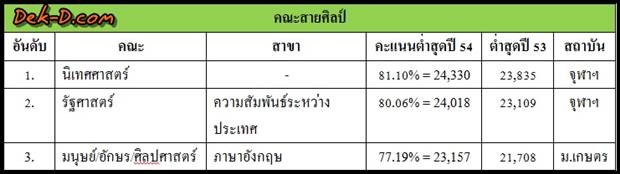 3 อันดับคณะสายศิลป์ที่มีคะแนนต่ำสุด สูงที่สุด ปี54