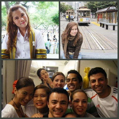 2. คุณสมบัติของคนที่จะเป็นลูกเรือได้ เช่น นิสัย การเรียน สุขภาพ ความจริงแล้วจบด้านไหนก็ได้ค่ะ ขอให้มีความรู้ด้านการสื่อสารและปรับตัวได้ง่าย แต่ปัจจุบันก็มีหลายคณะที่เปิดสอนเรื่องการบินโดยตรง ก็ขึ้นอยู่กับว่าน้องๆ อยากเรียนด้านไหนมากกว่า เพราะในความเป็นจริง พี่ว่าทุกเนื้อหาเอาไปประยุกต์ในการสมัครได้หมด คนจบวิศวกรรมมามาเป็นแอร์ยังมีเลยจ้ะ ส่วนเรื่องอุปนิสัย พี่ว่าสิ่งที่สำคัญที่สุดคงจะเป็นเรื่องทัศนคติและการปรับตัว งานลูกเรือเป็นครูสอนประสบการณ์ชีวิตพี่ได้อย่างดีเลยทีเดียว มันทำให้พี่เปลี่ยนทัศนคติไม่ดีของตัวเองไปเลย และได้เรียนรู้อะไรมากขึ้น มีเพื่อนๆ แอร์ทั้งคนไทยและต่างชาติที่สนิทๆ ช่วยเหลือดูแลกันตลอด ได้เห็นโลกเรียนรู้วัฒนธรรมความเป็นอยู่ รู้จักลูกเรือหลายชาติซึ่งแต่ละคนก็ต่างกันไป