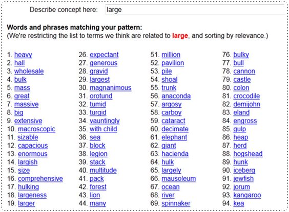 นอกจากนี้คำที่เสิร์ชขึ้นมาบางคำไม่ได้แปลว่าใหญ่โดยตรงแต่จะเกี่ยวข้องหรือมีความสัมพันธ์แบบต่างๆ เช่น sea(36) หมายถึง ทะเล แต่ด้วยคุณสมบัติของทะเลที่ทั้งกว้างและใหญ่ เลยโดนเข้าข่ายคำว่า large หรือ size(15) ที่ไม่ได้แปลว่าใหญ่โดยตรง แต่ก็เกี่ยวข้องในฐานะที่เป็นหมวดหมู่ และ large ก็เป็นศัพท์ที่อยู่ในหมวดนั้นหรือที่เรียกว่าเป็นคำลูกกลุ่มนั่นเอง