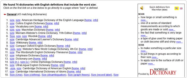 จากตัวอย่าง พี่มิ้นท์ลองคลิกที่คำว่า size(15) จะเห็นว่าหน้าต่างถัดไป ระบบจะจับคู่คำว่า size จากพจนานุกรมเล่มต่างๆ ขึ้นมาที่ด้านซ้าย น้องๆ ก็สามารถเข้าไปดูความหมายในภาษาอังกฤษได้เลย ส่วนแถบด้านขวาก็เป็นความหมายเช่นเดียวกัน และมีประโยคให้ดูเป็นตัวอย่างด้วยค่ะ