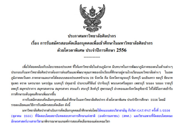 สวัสดีคร้าบบบบ สิ้นสุดการรอคอยสำหรับน้องๆ ที่อยากเรียน ม.ศิลปากร เพราะล่าสุดระเบียบการโควตาประจำปี 2556 ได้ออกมาแล้วคร้าบ ปีนี้รับจำนวนเลขสวยซะด้วย มากถึง 1555 คน รายละเอียดเป็นยังไงไปดูกัน