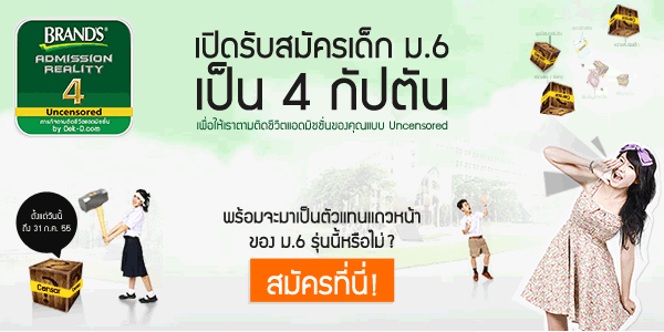 โค้งสุดท้ายกันแล้วนะคะ กับการรับสมัคร 4 กัปตันตัวแทนเด็กแอดมิชชั่น 56 ในโครงการ BRAND'S Admission Reality ปี 4 ที่ปีนี้พี่ทีมงาน Dek-D.com จะมาช่วยเคลียร์จุดอ่อน เสริมจุดแข็ง แบบไม่เซนเซอร์ จนน้องแอดฯ ติด กันเลย ใครกันที่จะได้มาเป็นผู้นำ Admission Uncensored ปีนี้ อีกไม่นาน ก็จะได้รู้กันแล้วหล่ะค่ะ!!