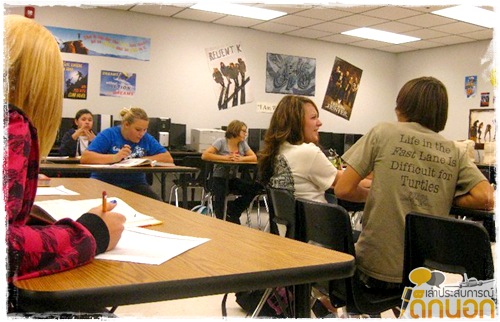 นอกจากนี้เรามีเพื่อนที่ท้องเยอะมาก!! ตอนแรกที่ไปเราก็แบบว่า พระเจ้า อะไรจะขนาดนี้!! คือใครท้องหรือแต่งงานก็จะมาโรงเรียนเหมือนปกติ พอช่วงใกล้คลอดก็หยุดไป พอคลอดเสร็จก็กลับมาเรียน เค้าเห็นว่าเรื่องนี้เป็นเรื่องปกติไปแล้ว .... อย่างเพื่อนเราคนหนึ่งชื่อ Maranda ตอนนั้นเค้าอายุ 16 แต่ลูกเค้าอายุ 2 ขวบ บางทีเค้าก็เอาลูกมาเลี้ยงที่โรงเรียน พ่อเด็กก็เป็นเพื่อนกับเราอยู่ชั้นเดียวกัน วันแรกที่เราไปโรงเรียนก็เจอเลย นั่งอยู่ในคลาส กำลังเอ๋อๆ พยายามทำงานที่ครูให้แบบงงๆ เพราะฟังก็ยังไม่รู้เรื่อง แต่ Maranda ซึ่งนั่งอยู่ข้างเรากลับฝากให้เราดูลูกเค้าให้หน่อย เค้าจะไปเติมน้ำแป๊บนึง = =" ปรากฏเค้าไปนานมากๆ แล้วเด็กก็ร้อง เรานี่ต้องคอยโอ๋ คอยป้อนนม ทำทุกวิถีทางให้เด็กหยุดร้อง ทุกคนก็มองมาที่เรา ตอนนั้นอายมากๆ แต่สุดท้ายตอนหลังก็ได้เป็นเพื่อนกัน เพื่อนบางคนชอบให้เราเอาลูกเค้าไปอุ้ม เพราะอยากฟังเราร้องเพลง เราก็จะร้องพวกแบบ นกกาเหว่า จันทร์เอ๋ยจันเจ้าให้ฟัง เค้าบอกว่าเพราะมาก เค้าชอบให้เราร้องเพลงไทยให้เค้าฟัง แอบภูมิใจนิดๆ อิอิ^^