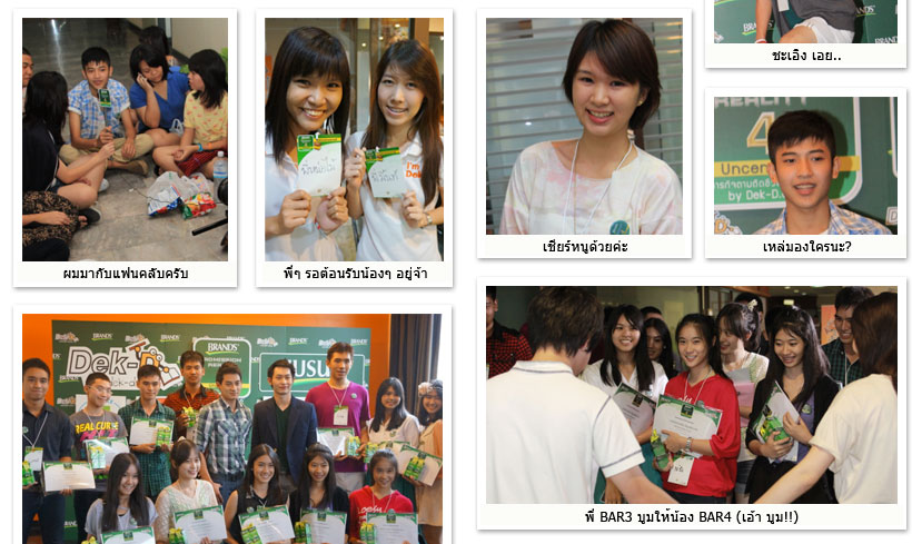 | ผ่านไปแล้วสดๆ ร้อนๆ ค่ะ กับการออดิชั่น 25 ผู้เข้ารอบ โครงการ BRAND'S Admission Reality ปี 4 ที่ได้ถ่ายทอดออนไลน์แบบสดๆ ผ่านเว็บ Dek-D.com ไปเมื่อไม่นานมานี้ และเป็นอีกปีที่น้องๆ ทั้ง 25 คนทำเอา คณะกรรมการหนักใจกันมาก เพราะต่างคนต่างงัดความสามารถมาโชว์จน สตูดิโอ Dek-D แทบแตก !! ขอบอกว่า พี่ๆ ทีมงาน Dek-D.com ต้องไปฟิตร่างกายมาเหมือนกัน เพื่อเตรียมมารับมือน้องๆ ในวันออดิชั่น ที่แต่ละคนพลังงานเหลือเฟือกันสุดๆ ทั้งร้องเพลงจนขนลุก เต้นกันฉากเกือบพัง เล่นดนตรีกันประหนึ่งมีคอนเสิร์ต จัดเต็มจนกรรมการสุดจี๊ดทั้ง 4 คน ทั้ง พี่ปอนปอน (เว็บมาสเตอร์เว็บ Dek-D) ,พี่โอ (กฤษณพงศ์ ถาวรสมบัติ ตัวแทนจากผลิตภัณฑ์แบรนด์ซุปไก่สกัด) ,พี่จูน (บรรณาธิการเว็บ Dek-D) และ พี่ลาเต้ (ตัวพ่อวงการแอดมิชชั่น) ตัดสินได้ยากสุดๆ ว่าใครจะได้เป็นผู้เข้ารอบสู่ด่านต่อไป (โอ้ย ลุ้นๆ) งานนี้ผู้เข้ารอบ 25 คน ทั้งรอบเช้า- รอบบ่าย ทำให้บรรยากาศงานคึกคักสนุกสนานตั้งแต่เช้าจนเย็นค่ะ แถมยังได้รุ่นพี่แอดมิชชั่นเรียลลิตี้ตั้งแต่ปี 1-3 มาร่วมเชียร์ และให้กำลังใจน้องกันอีกด้วย ดูได้จากภาพและคลิปที่พี่แนนเก็บมาฝากกันได้เลยค่ะ ทุกซอกทุกมุมทุกฐาน ทุกด่านที่น้องๆ ทั้ง 25 คนได้เจอ จะโหด หรือหิน หรือมีแต่ฮา ไปดู ณ บัด now จ้า อิอิ ดูบรรยากาศจบแล้ว อย่าลืมมาร่วมลุ้น ร่วมเชียร์กัน และติดตามว่าใครจะได้เป็น 4 กัปตันตัวจริงแห่ง BRAND'S Admission Reality ปี 4 ที่จะนำทีมเด็ก ม. 6 เคลียร์จุดอ่อน เสริมจุดแข็ง แบบอันเซนเซอร์จนคุณแอดฯ ติด ลุ้นไปพร้อมๆ กัน และรู้พร้อมๆ กัน เร็วๆ นี้!! |