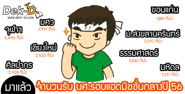 สวัสดีครับ ปีนี้ระเบียบการแอดมิชชั่น และรับตรงออกมาค่อนข้างเร็วมากนะครับ พี่ลาเต้ ว่าคงเป็นข้อดีช่วยให้น้องๆ มีเวลาเตรียมตัวกันอย่างเต็มที่ อย่างล่าสุดสดๆ ร้อนๆ ทาง สอท.ได้เผยข้อมูลจำนวนการรับนิสิต/นักศึกษาใหม่ประจำปี 2556 ในรอบแอดมิชชั่นกลางออกมาแล้วครับ มหาวิทยาลัยไหนรับกี่คน กี่คณะ ไปอัพเดทกันเลย