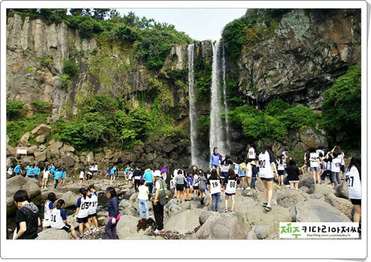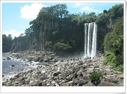 น้ำตกชองบัง (정방폭포) ตำนานเก่าแก่เล่าไว้ว่า ใต้น้ำตกนี้มีมังกรอาศัยอยู่
